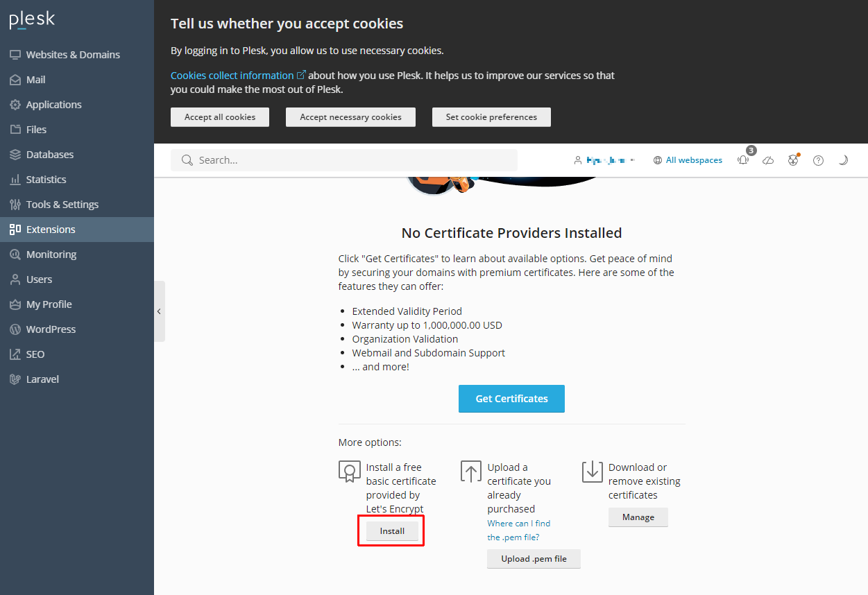 무료인증서인 Let's Encrypt 를 [Install] 합니다.