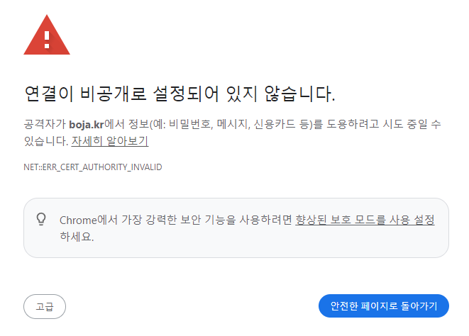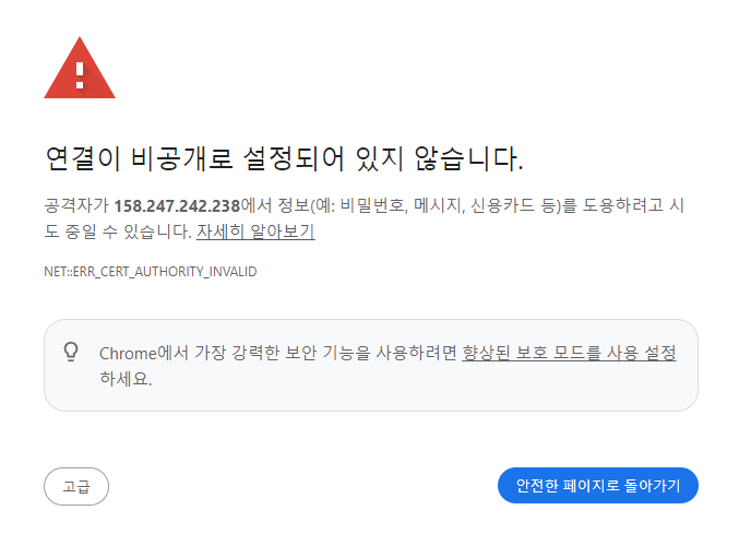 아직 ssl 이 적용되지 않았기 때문에 위와 같은 오류페이지가 뜹니다. 하단의 [고급] 버튼을 눌러 [xxx.xxx.xxx.xxx(안전하지 않음)(으)로 이동] 을 누르면 접속이 됩니다.