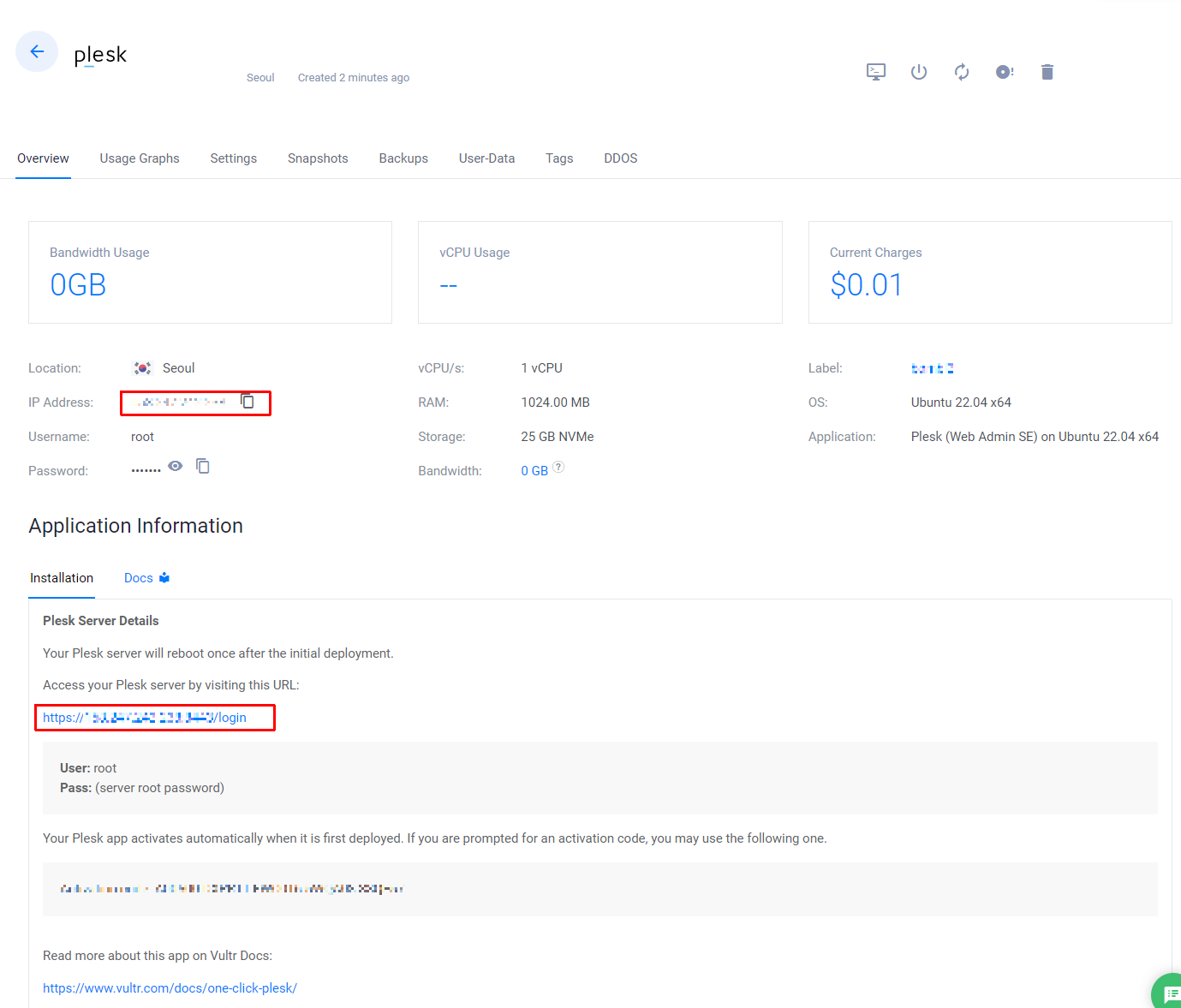 [Application Information] 섹션내의 링크가 plesk 패널에 접속할 수 있는 URL입니다. 클릭해서 들어갑니다.