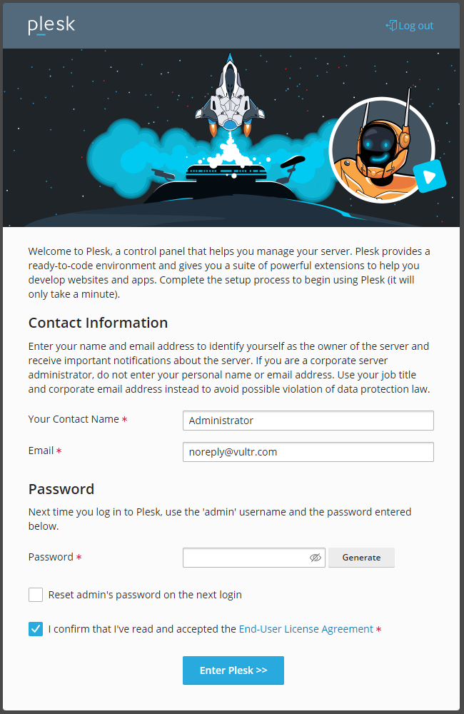 모두 설정하였으면 [Enter Plesk >>] 버튼을 누릅니다.