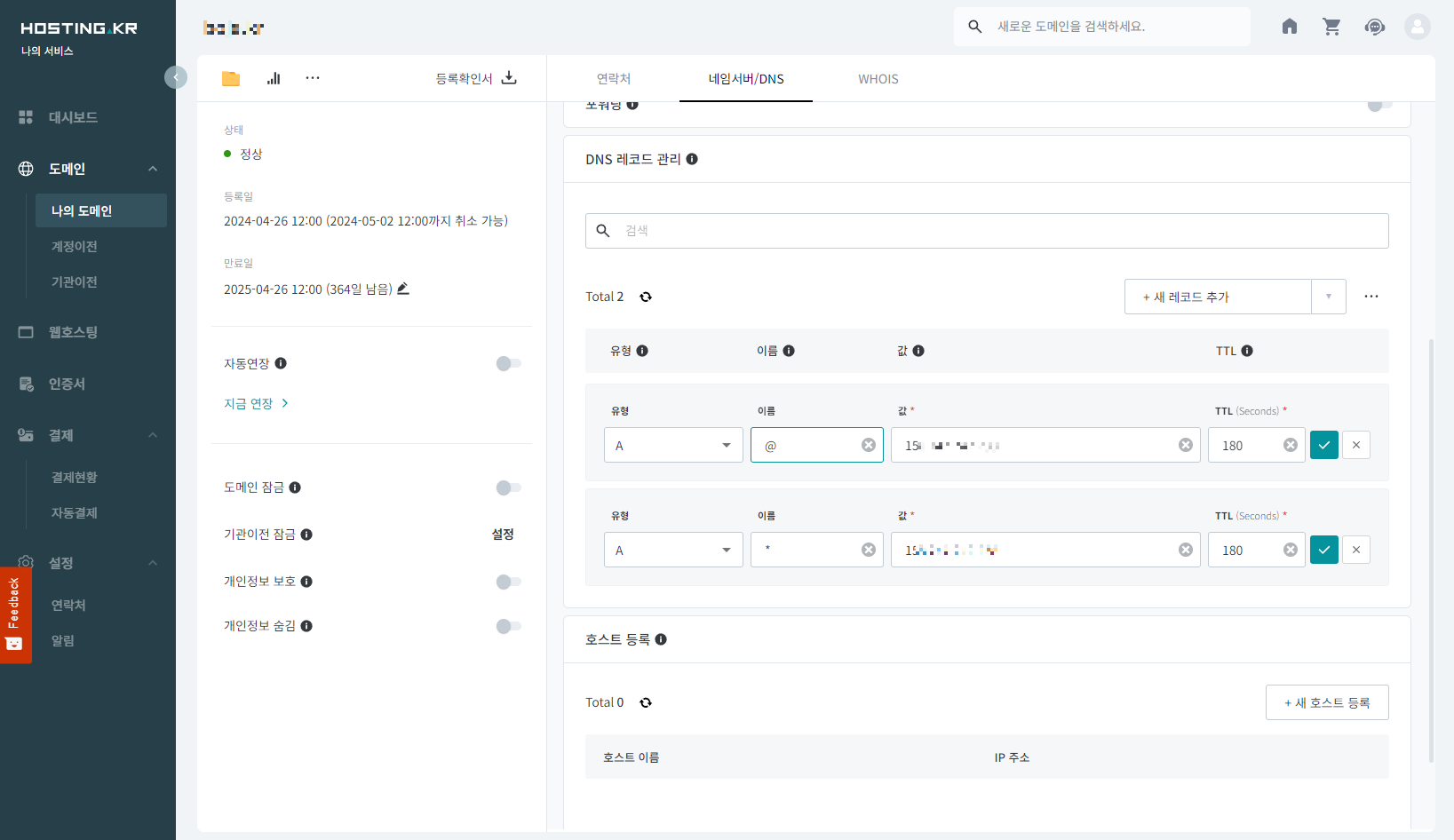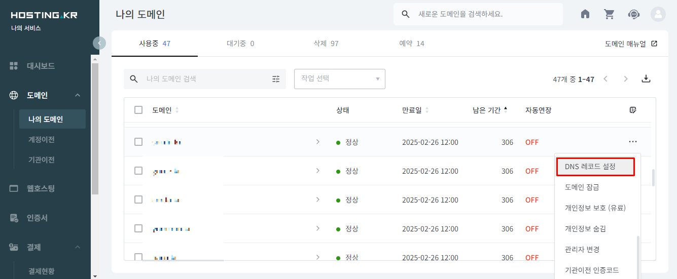 도메인은 각자가 구매한 회사가 다르기 때문에 특정해서 설명할 수가 없습니다. 저 같은 경우는 호스팅케이알(hosting.kr)을 이용하기 때문에 호스팅케이알 기준으로 설명드리겠습니다.