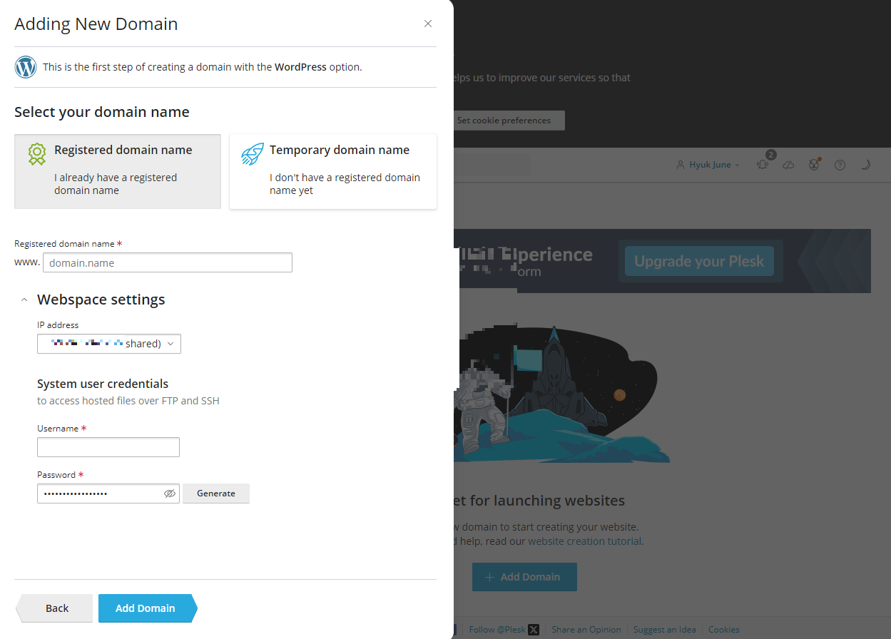 [Webspace settings] 를 펼쳐서 Username 과 Password 를 설정해 줍니다. 여기서 설정한 계정정보로 워드프레스 사이트가 생성됩니다. 파일관리를 위한 FTP와 SSH를 이용한 터미널 접속시에도 이 계정을 이용하면 됩니다.