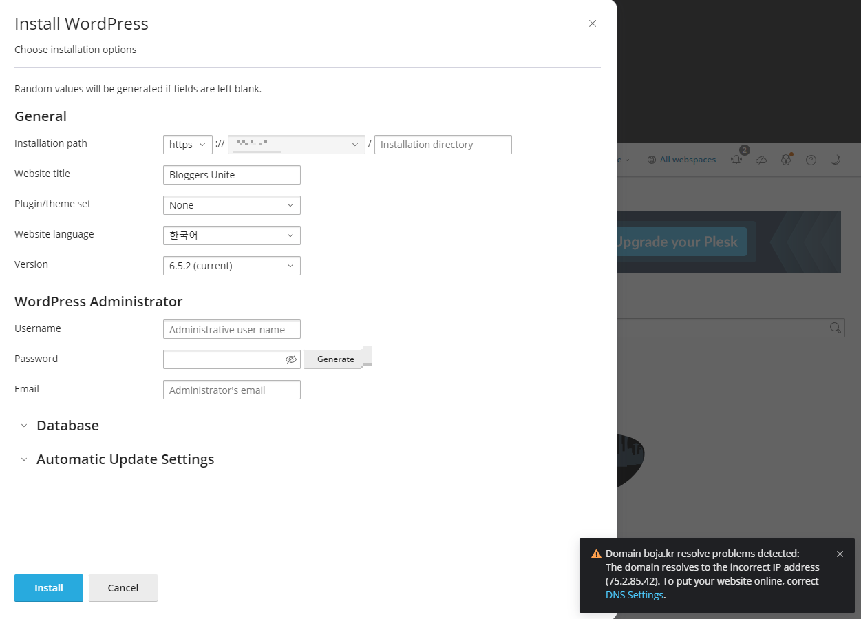 - Installation path: 워드프레스가 설치될 경로 (도메인만 치면 접속되게 하기 위해 Installation directory 는 비워두시기 바랍니다)