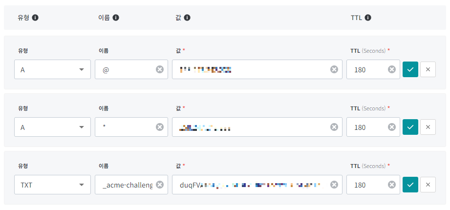[새 레코드 추가]를 두번 눌러 입력칸을 생성하고 유형은 A, 값은 생성한 서버의 아이피, 첫번째 항목의 이름은 @, 두번째 항목의 이름은 * (별표)를 입력해 줍니다. *는 와일드카드로서 어떤 서브도메인이라도 모두 연결시켜주는 역할을 합니다. 다 입력하였으면 오른쪽 v 버튼을 눌러 저장해 주면 완료됩니다.