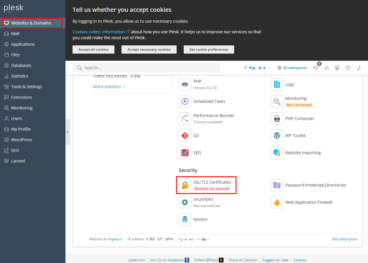 왼쪽의 plesk 메인메뉴 최상단 [Websites & Domains] 를 눌러 해당서버에서 [SSL/TLS Certificates] 를 눌러줍니다.