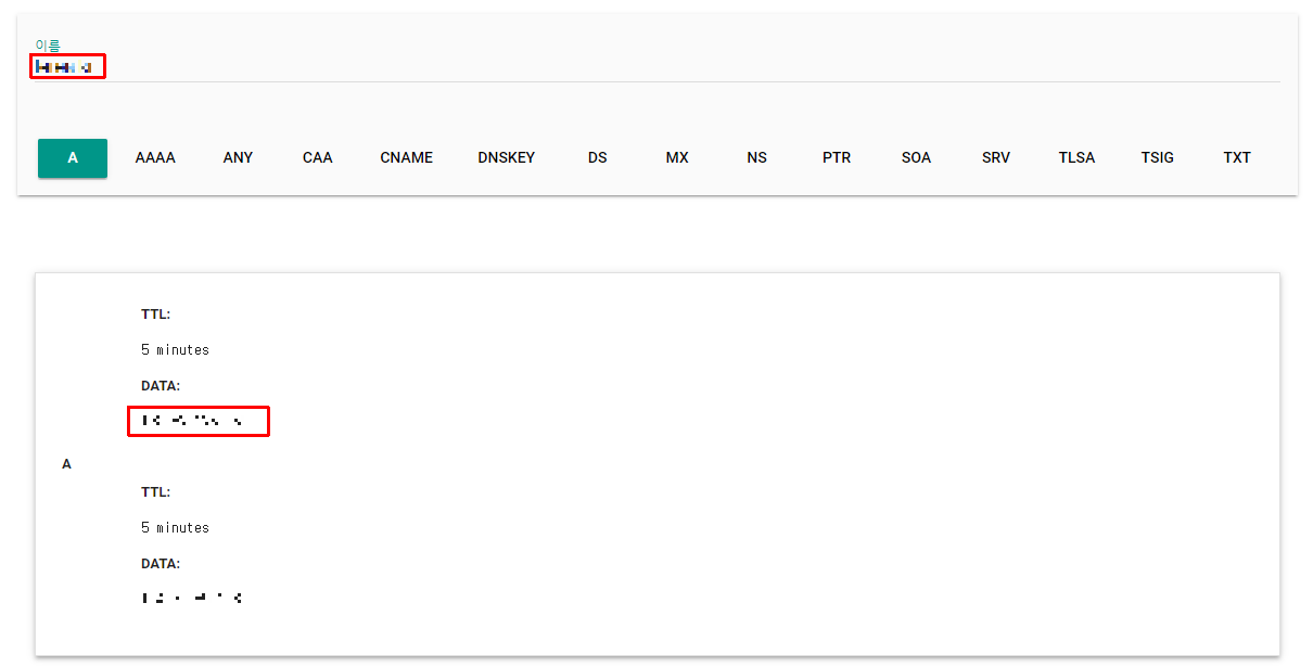 [이름]란에 https:// 를 제외한 도메인 주소를 입력하시고 하단의 [ A ] 버튼을 눌러봅니다. DATA: 란에 생성한 서버의 주소가 표시되면 연결이 완료된 것입니다.