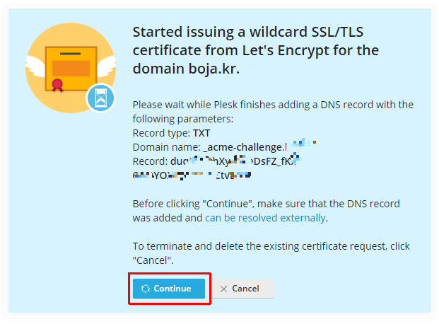 다시 plesk 화면으로 와서 [Continue]를 눌러줍니다.