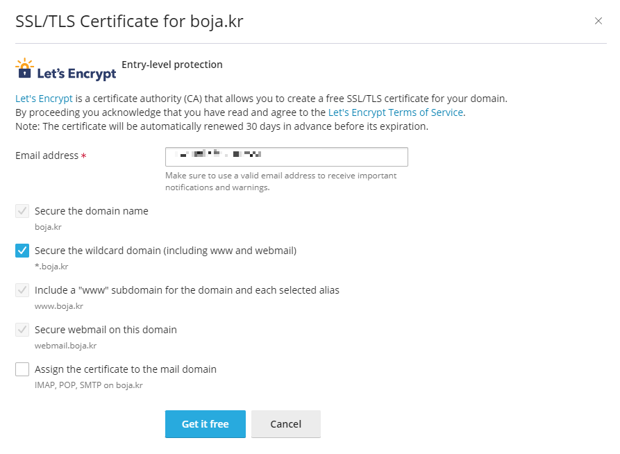 이메일을 입력해 줍니다. 그리고 두번째 와일드카드 도메인 보안 체크박스를 클릭해 줍니다. 이 글의 제목에서도 말씀드렸듯이 서브도메인을 여러개 생성할 것이기 때문에 서브도메인도 https 로 접속할 수 있게 하기 위함입니다.