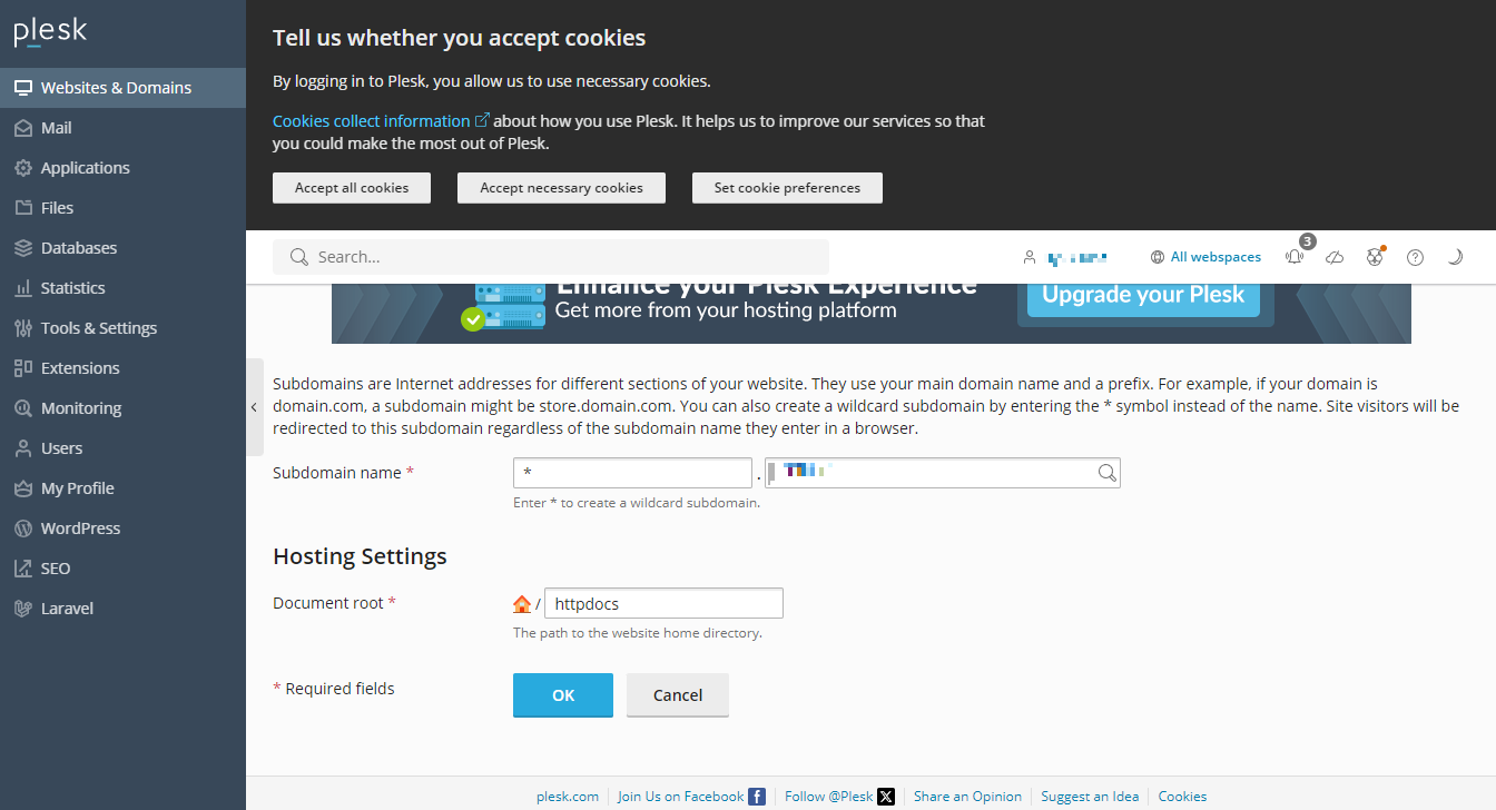 Subdomain name 을 와일드 카드문자 * (별포)를 입력하고 [OK] 를 누릅니다.