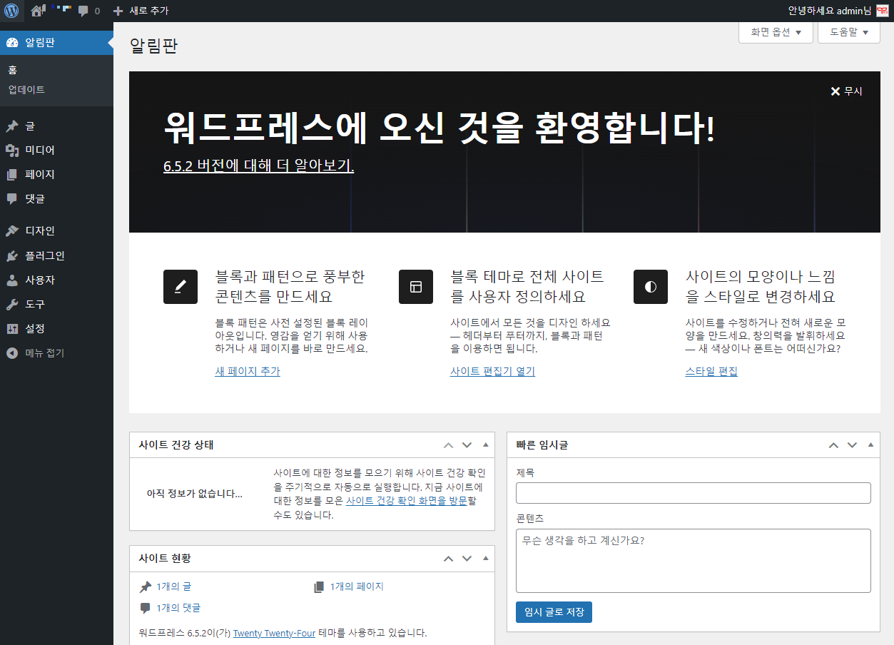 이제 워드프레스 관리자로 접속합니다.