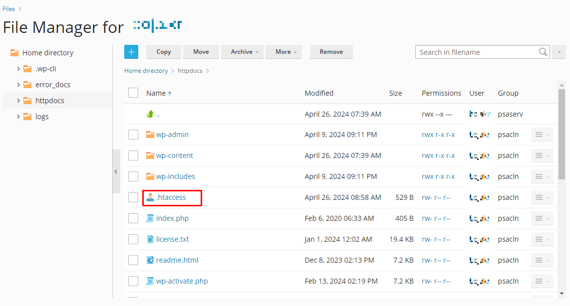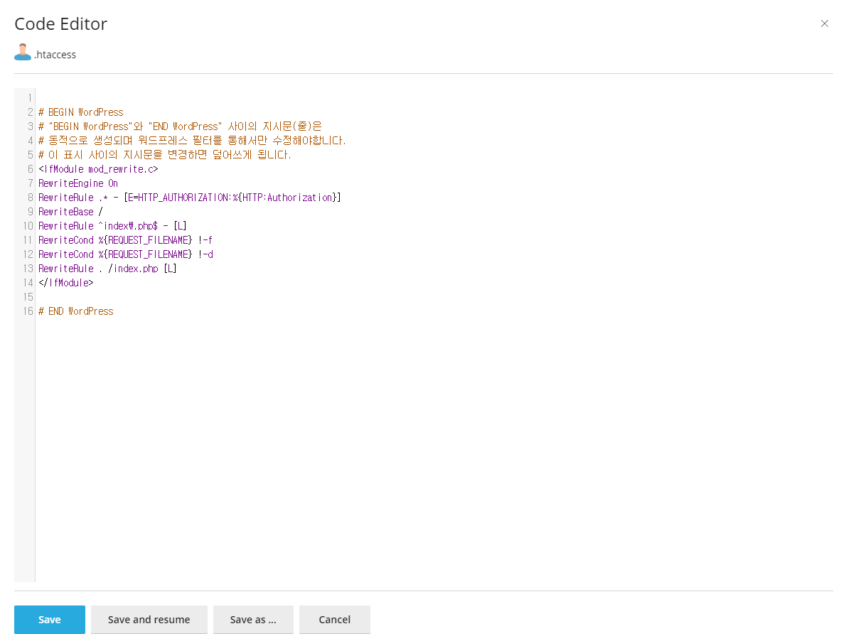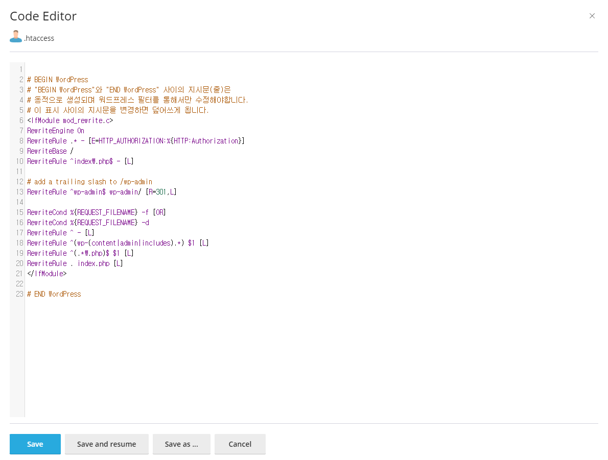 먼저 .htaccess 파일을 수정하기 위해 클릭을 합니다.