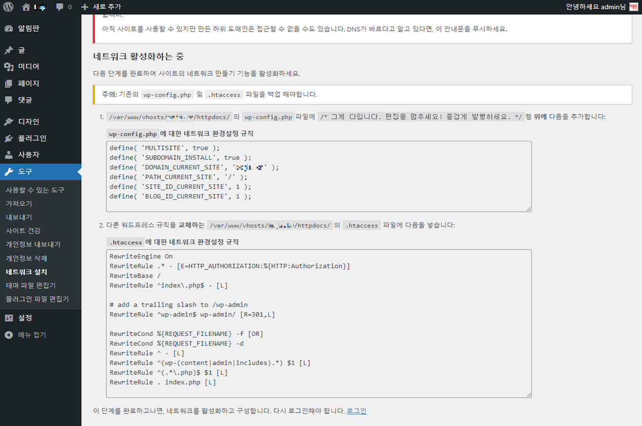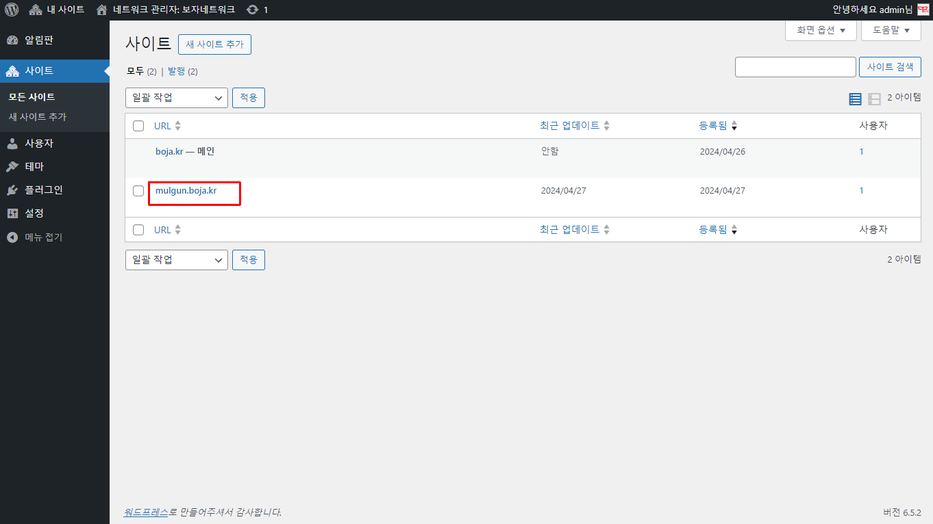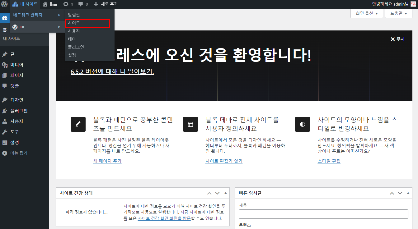 로그인 후 관리자로 들어와서 상단 [내사이트] 부분에 마우스를 갖다대어 보면 [네트워크 관리자]라는게 생겼습니다. 이제 부터 사이트를 막 찍어내면 됩니다. 일단 [사이트]메뉴를 눌러보세요