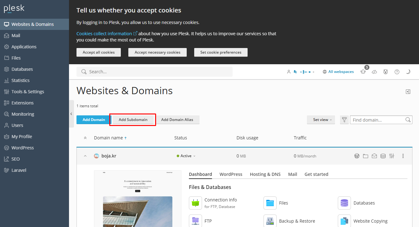 먼저 pleak 관리자 [Websites & Domains] 화면에서 [Add Subdomain] 을 눌러주세요.
