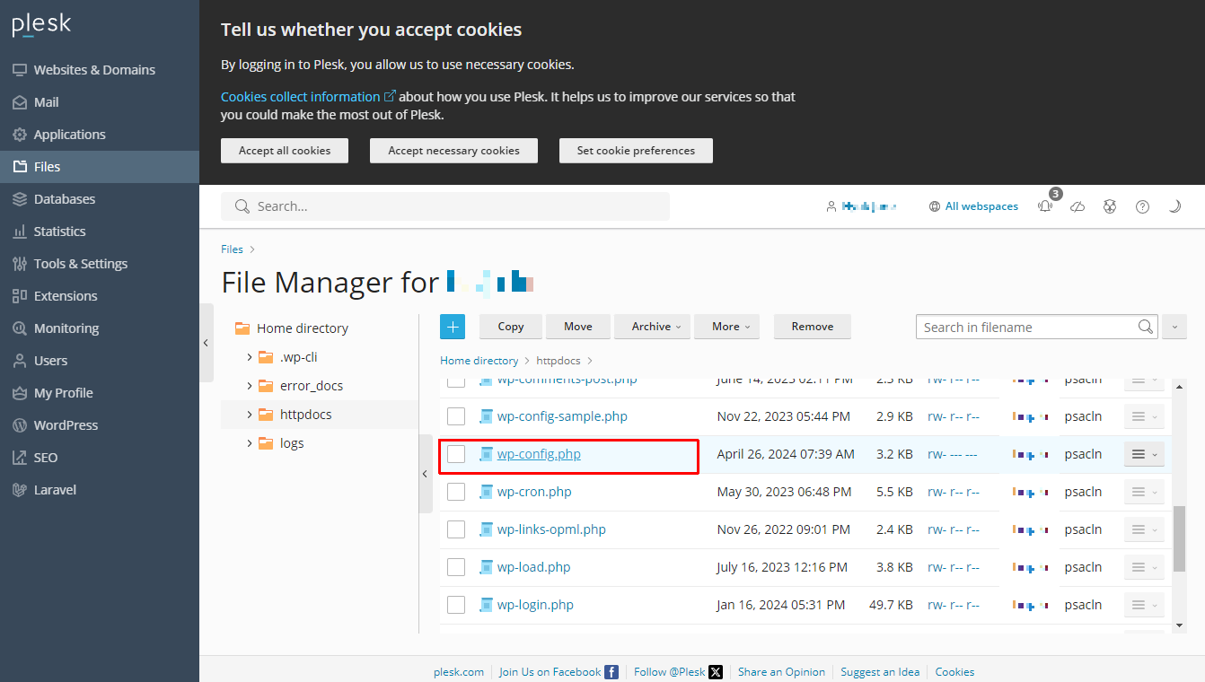 위와 같은 화면이 뜹니다. /.htaccess 파일과 /wp-config.php 파일을 위 내용을 수정 또는 추가해야 합니다. 걱정마세요. 파일수정을 위해 FTP에 접속할 필요가 없습니다. plesk 에 다 있습니다.