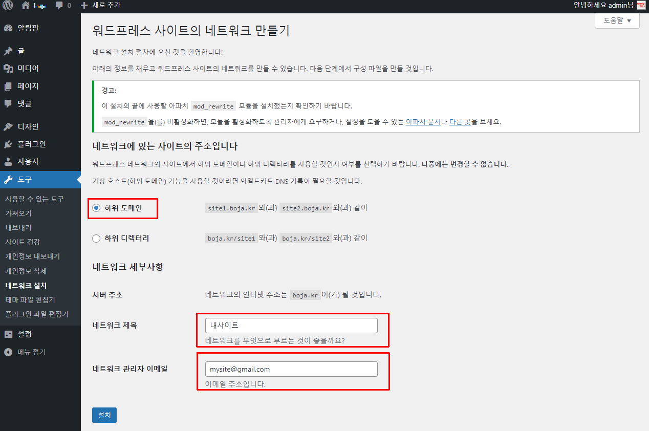 서브도메인으로 만들것이기 때문에 [하위 도메인]을 선택해 줍니다. 네트워크 제목은 임의로 입력하고 이메일은 본인의 이메일주소를 입력해 줍니다. 그리고 [설치]를 클릭해주세요