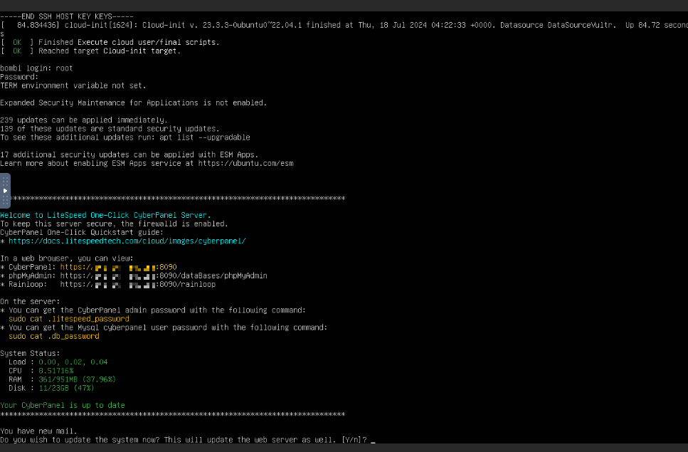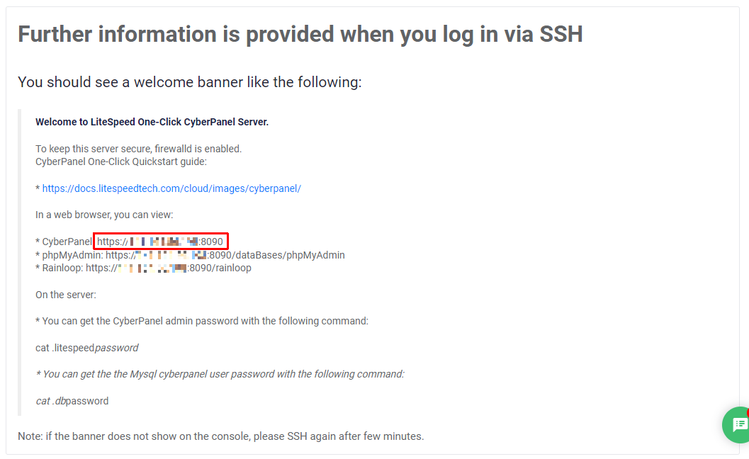 하단으로 드래그 해보시면 위와 같이 CyberPanel 에 접속할 수 있는 URL을 볼 수 있습니다. 이외에도 데이터베이스를 관리할 수 있는 phpMyAdmin 과 메일과 관련한 Rainloop 등이 있습니다. CyberPanel 에 접속하기 위해서는 비밀번호를 알아야 합니다. 비밀번호를 알기위해서는 서버에 터미널로 연결을 하여야 합니다.